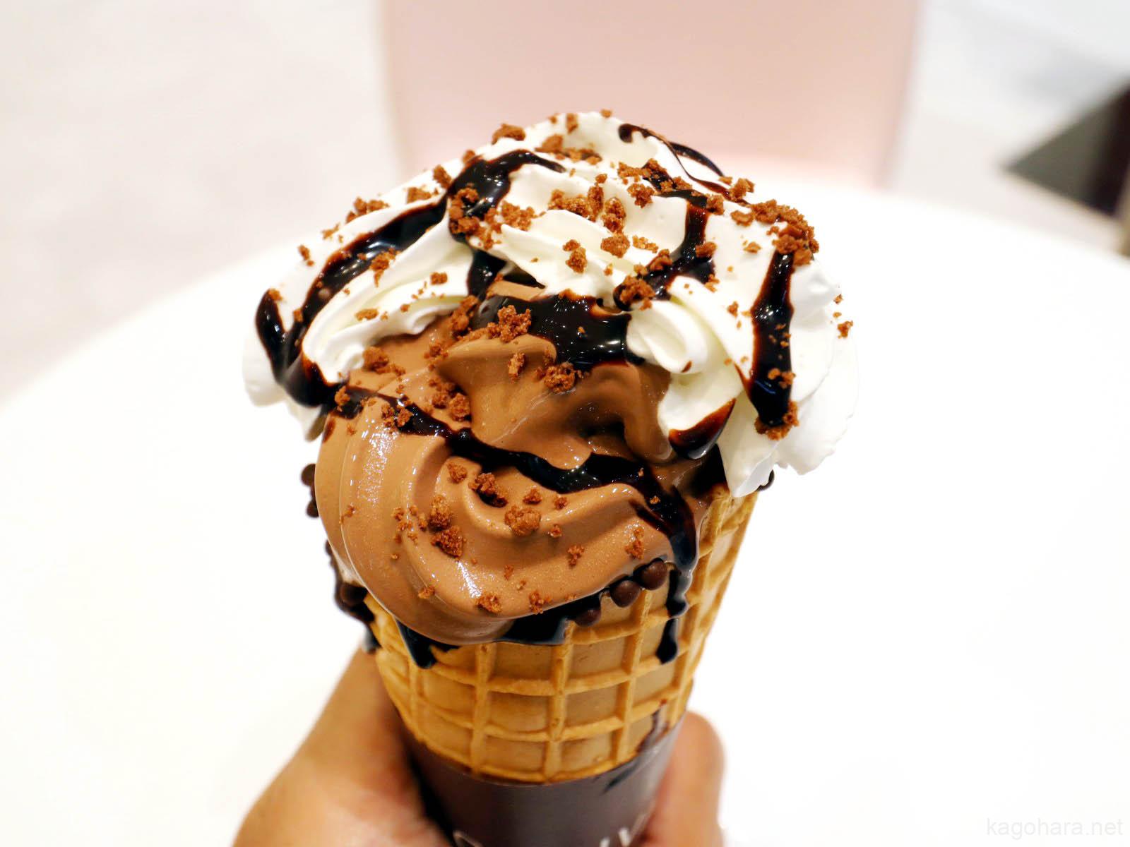 ワッフル生地のコーンにたっぷりのチョコソフトとホイップクリーム。