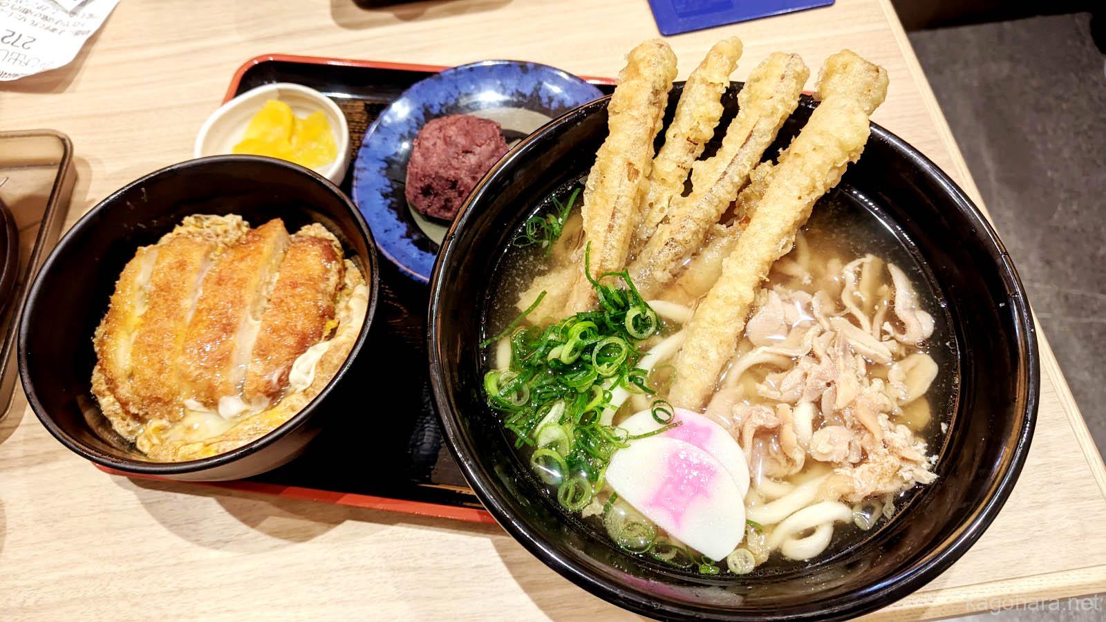かしわごぼ天うどんとミニカツとじ丼とぼたもちのセットです。