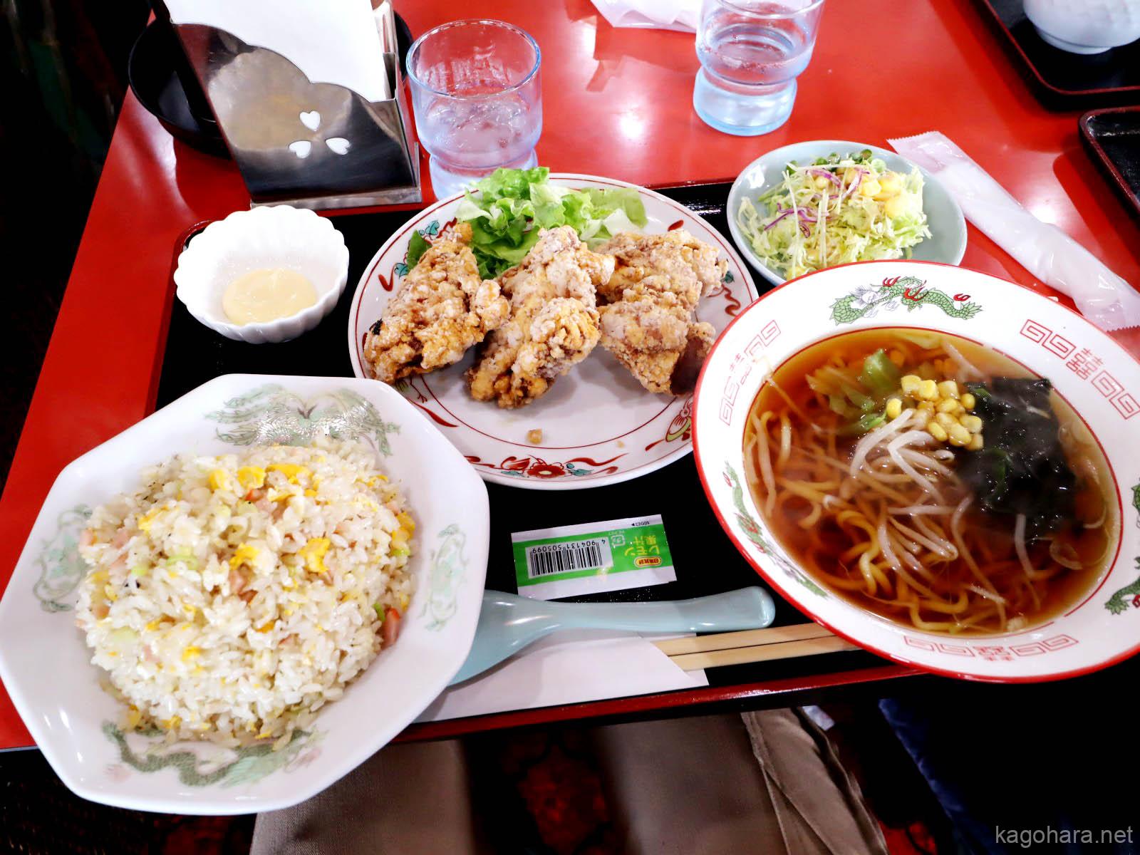 チャーハン、半ラーメン、唐揚げ、サラダという構成。