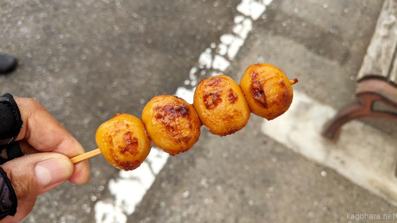 粘度低めの硬派なだんごは出汁醤油を塗られて非常に香ばしい。