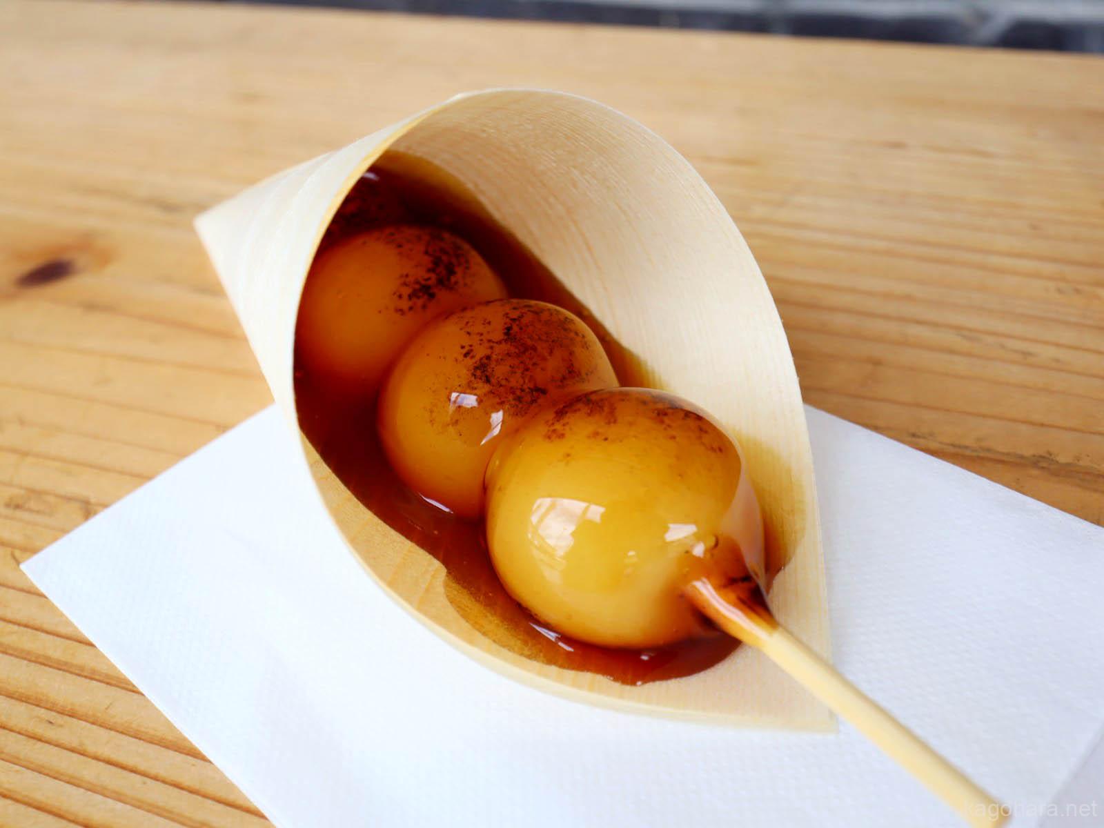 だんごに醤油塗ってから炙り、香ばしく焦がしてからあつあつの特製のみたらしをくぐらせました。奥行のある、小川庵特製のみたらしだんごです。