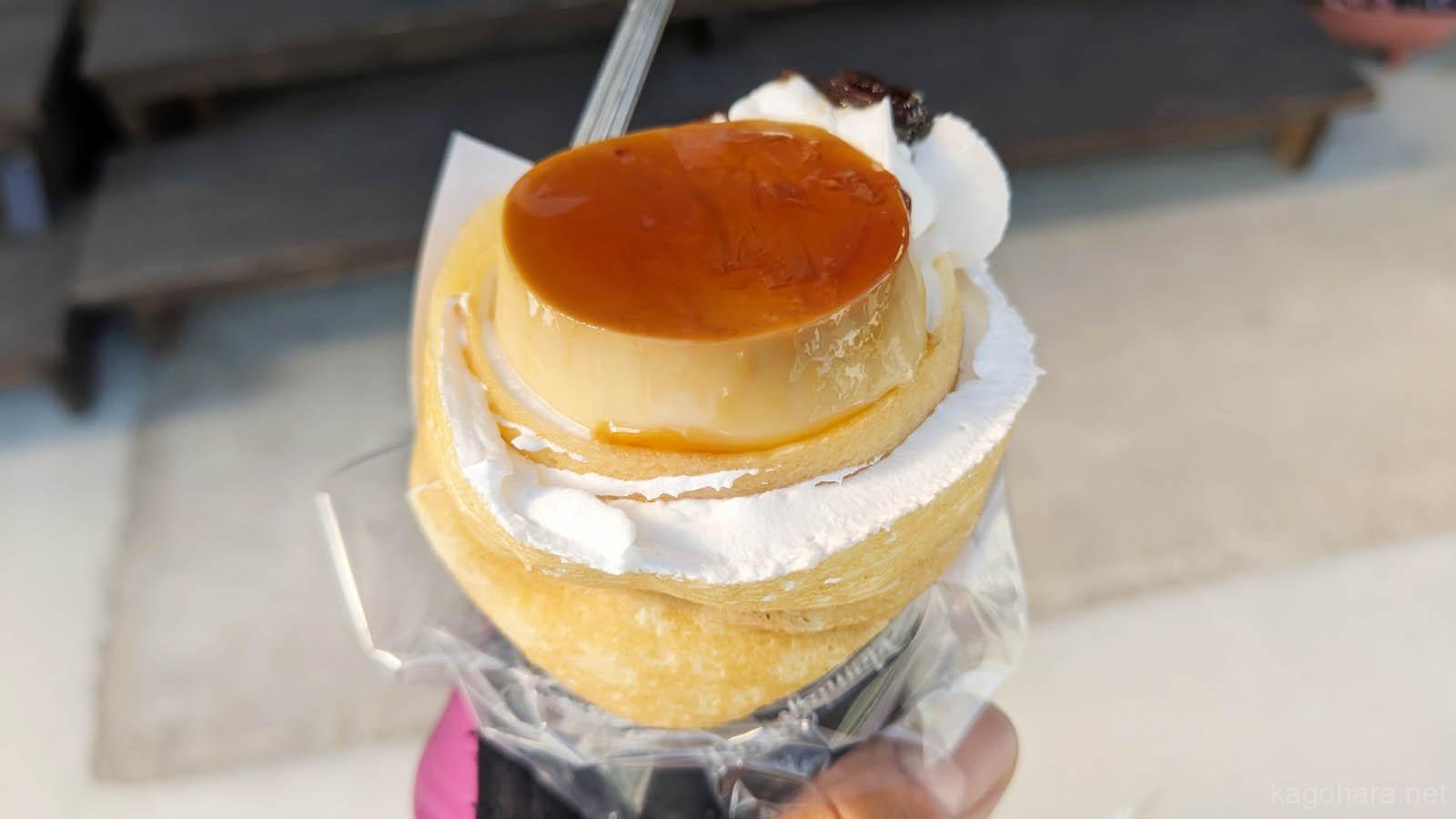 今回はラムレーズンクレープにプリンをトッピングでいってみましょう。