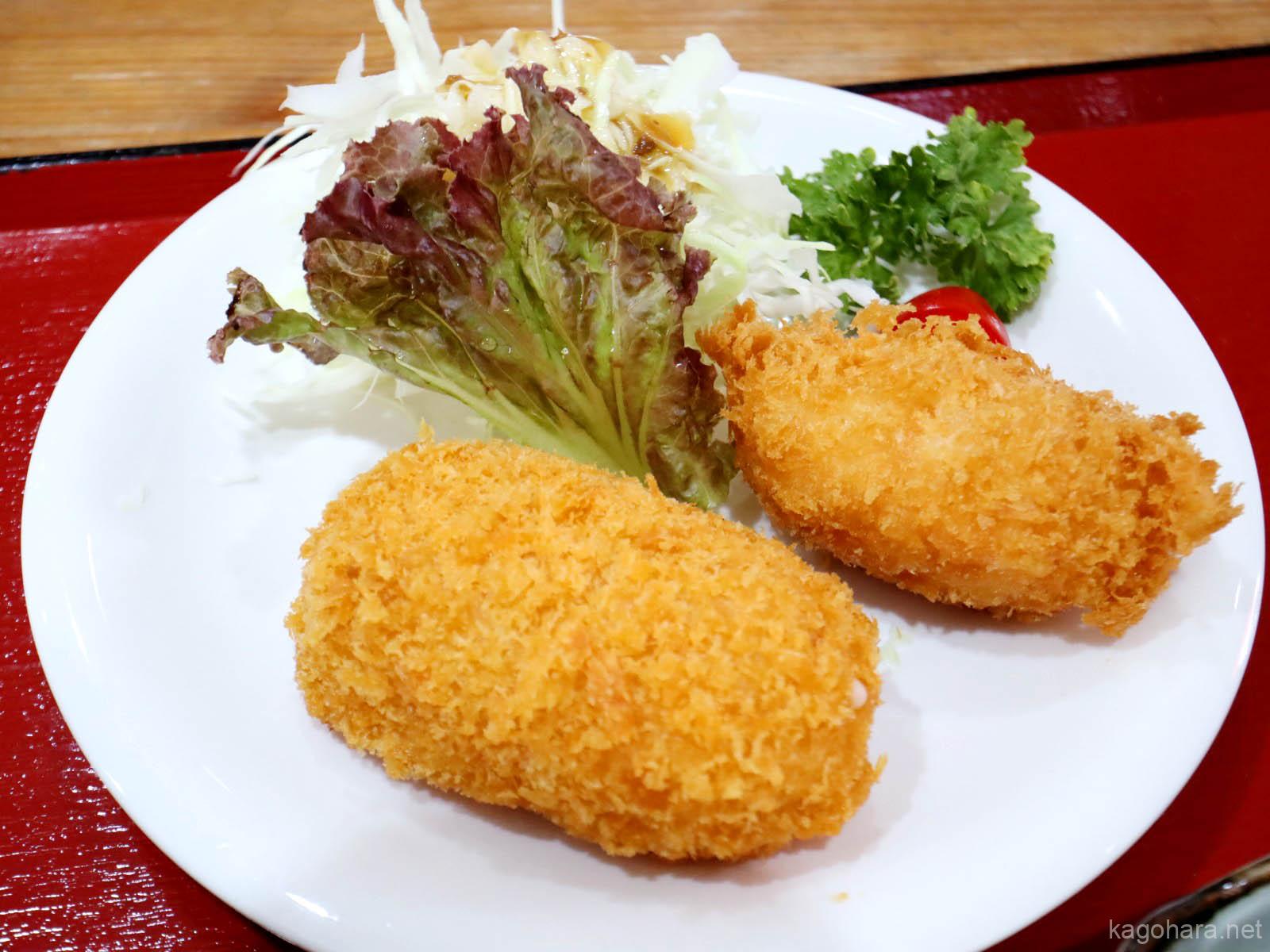 カニクリームコロッケ2種類とご飯、味噌汁、小鉢、漬物がつきます。