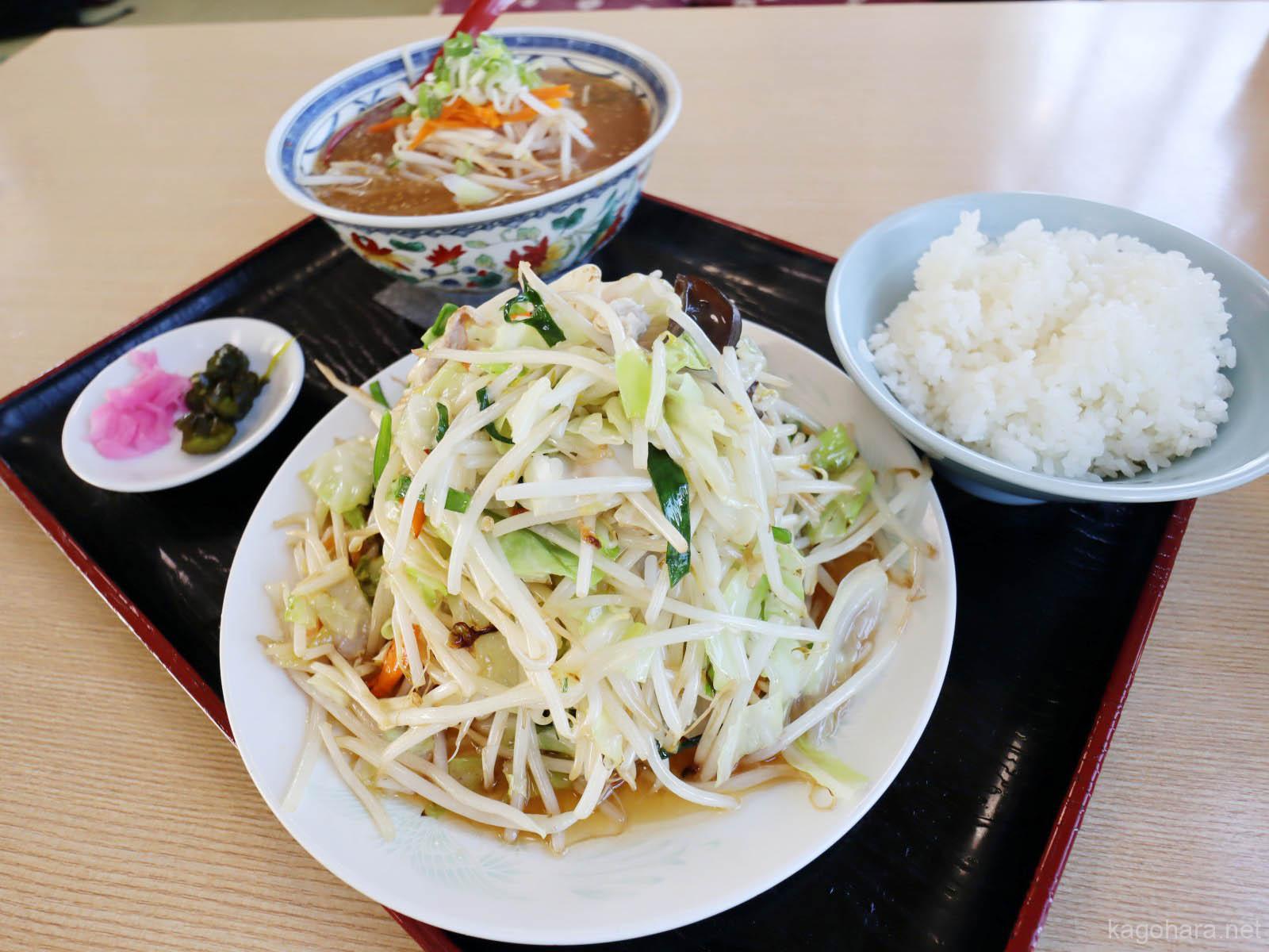 肉野菜炒め、ライス、半ラーメン、お新香のセットとなります。