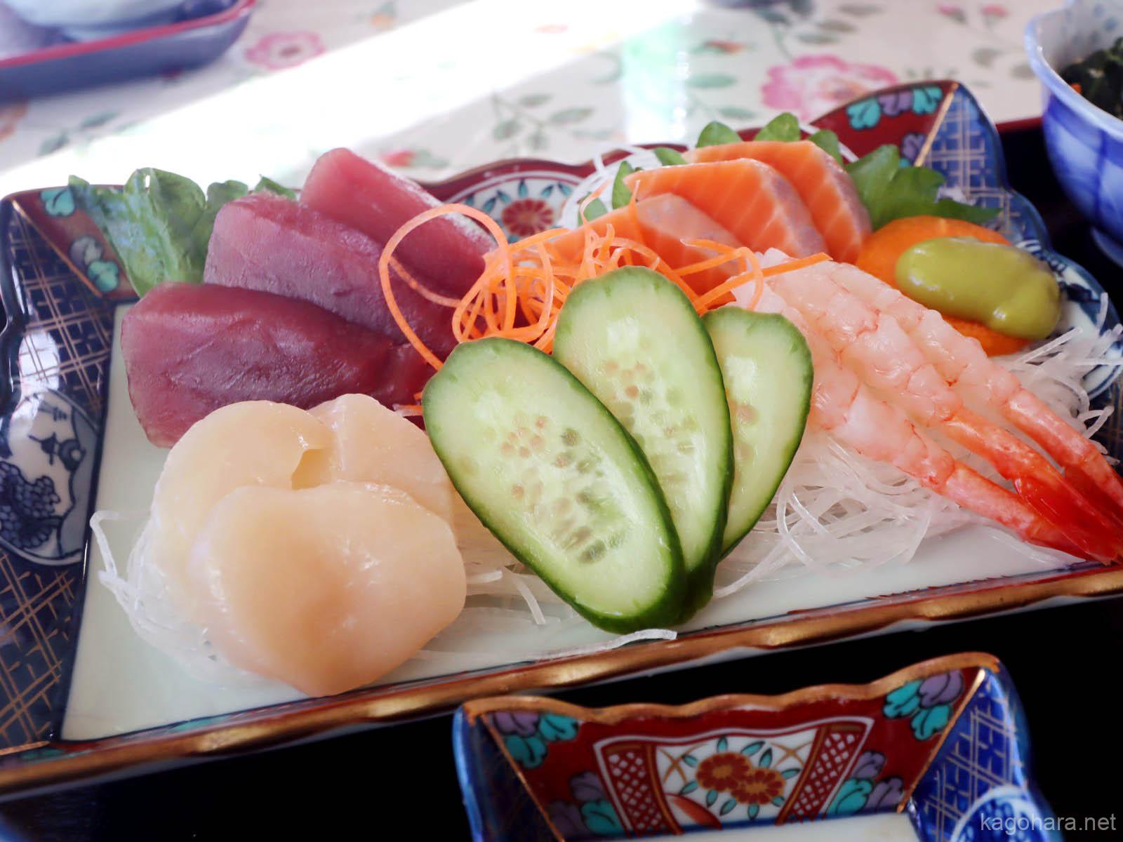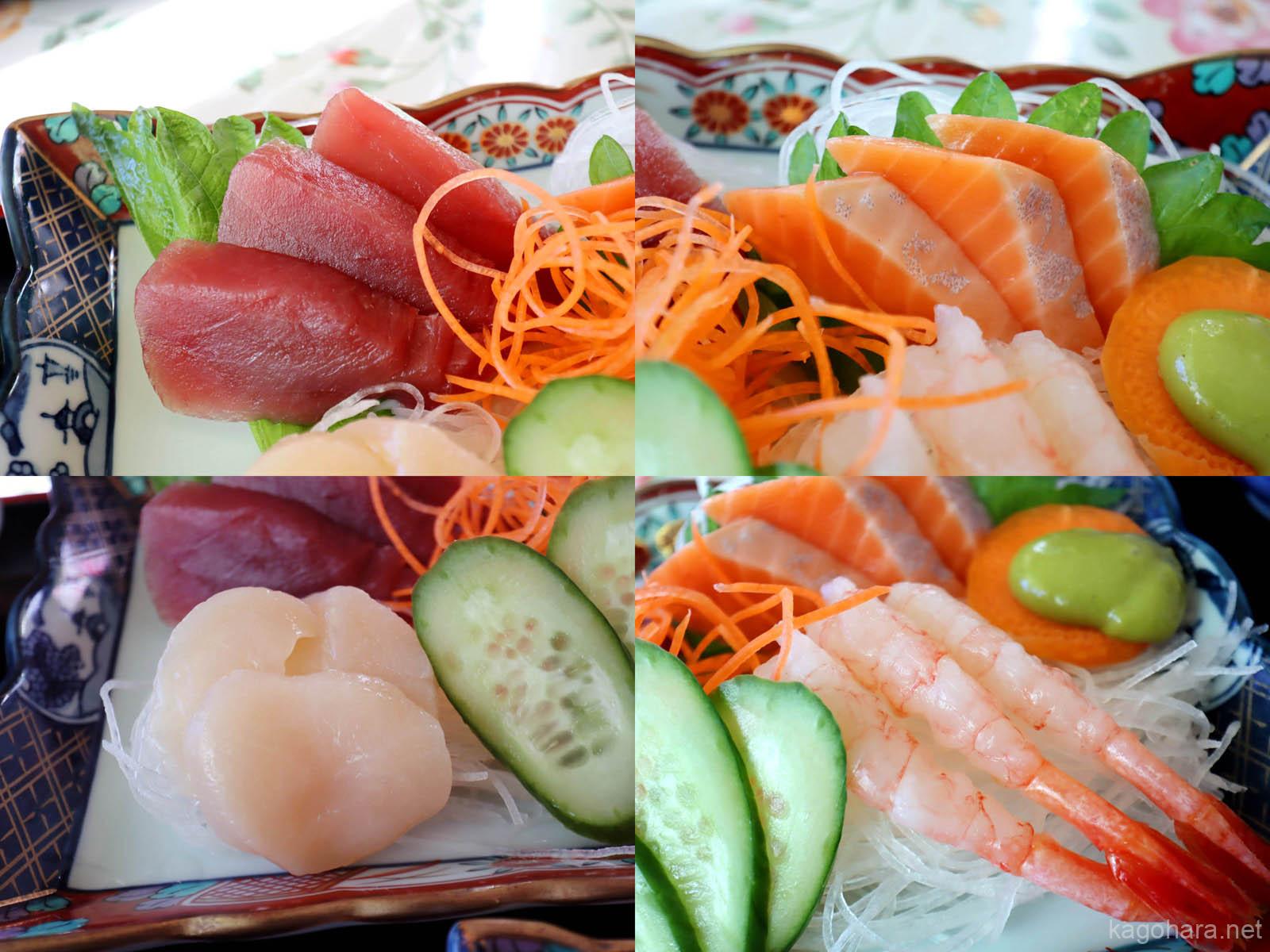 メインの刺身はマグロ、サーモン、ホタテ、甘エビの4品。