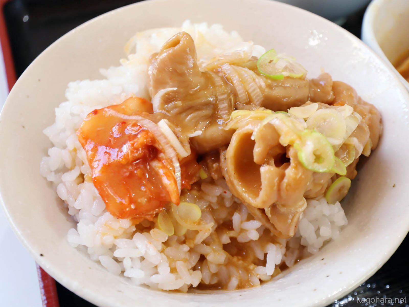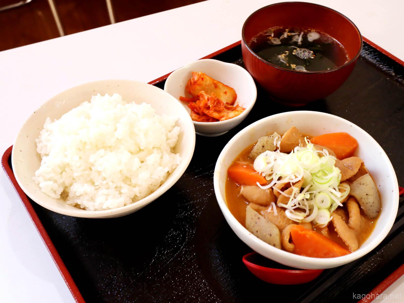 ピリ辛のもつ煮の定食で、もつ煮、ご飯、スープ、キムチが付きます。