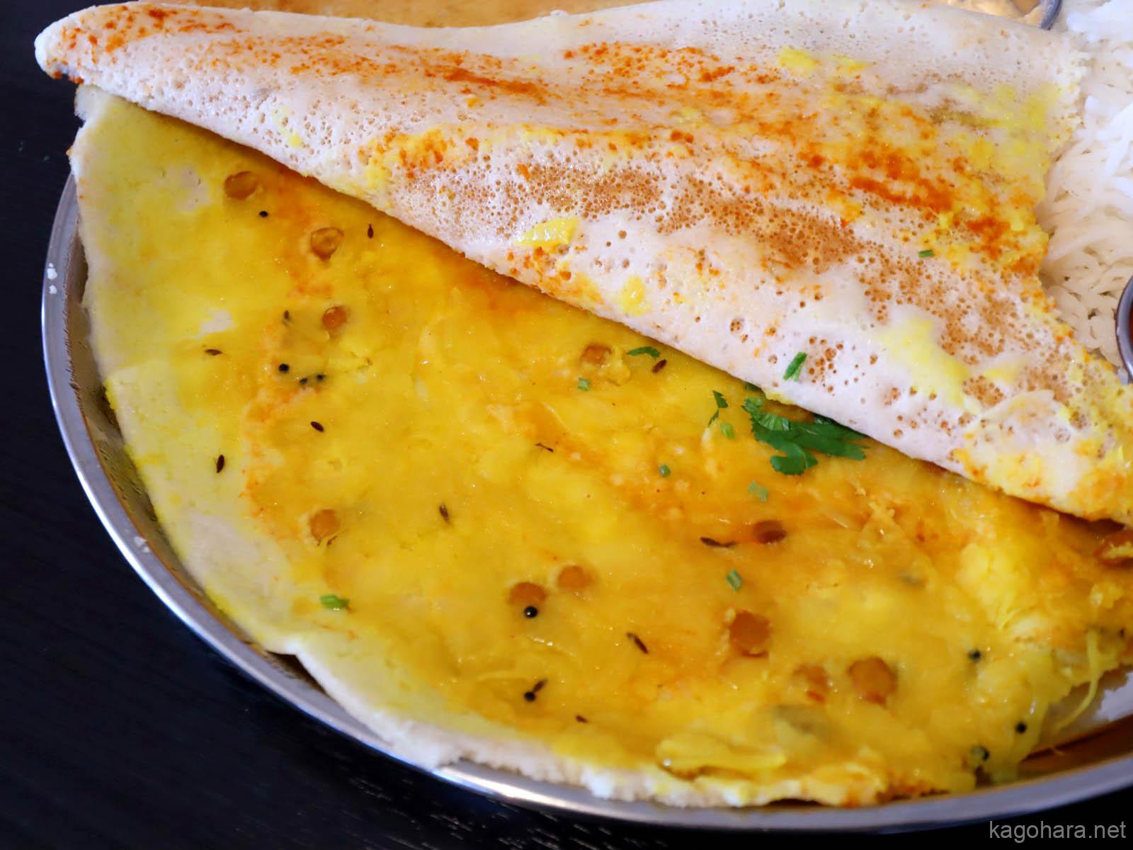 ドーサは分厚いクレープ生地にカレー味のポテトを薄く伸ばしたようなもの。
