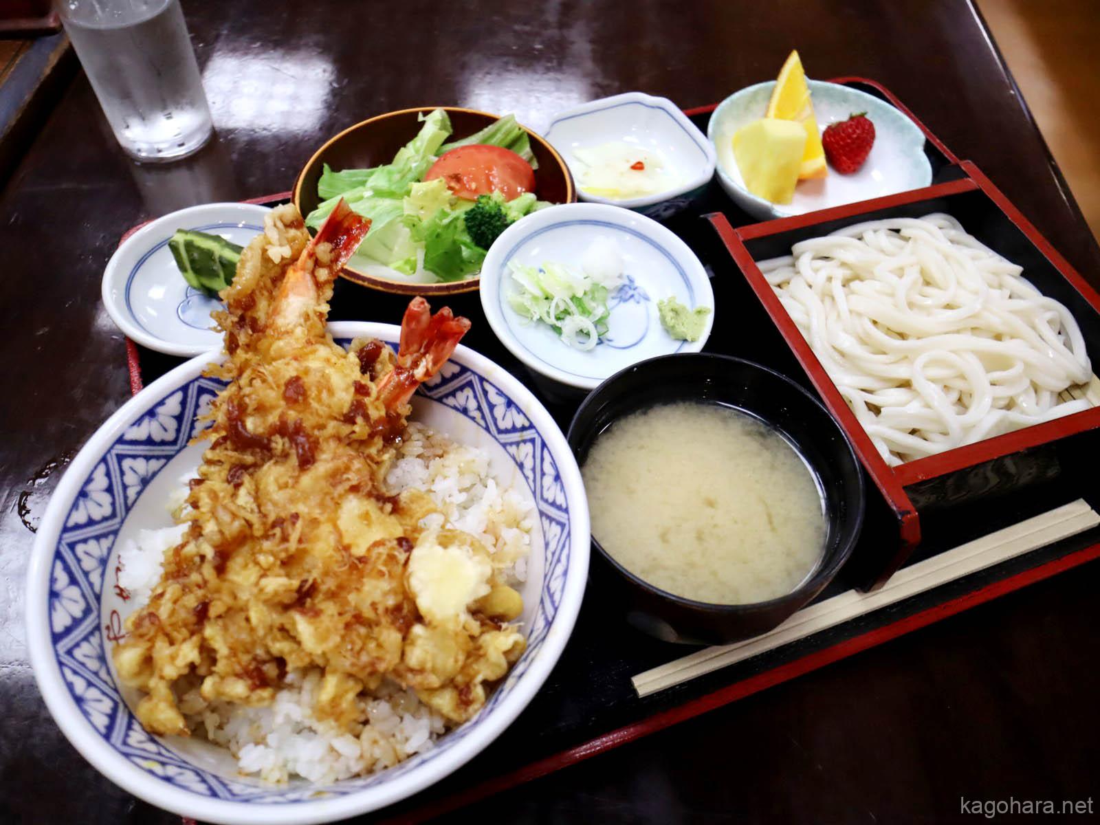 富士吉田市の老舗店で大きな海老の天丼とうどんを堪能!